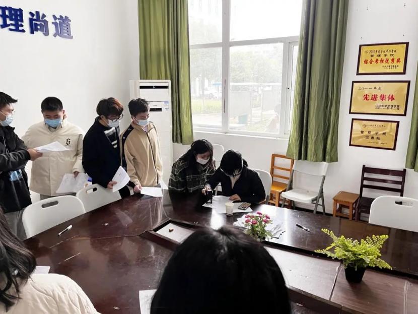 办公会后,张蕾经理援手学院辅导员为员工办理请假单审核和盖章批复,员工们近距离与张经理交流,感到学院领导,老师的关心。